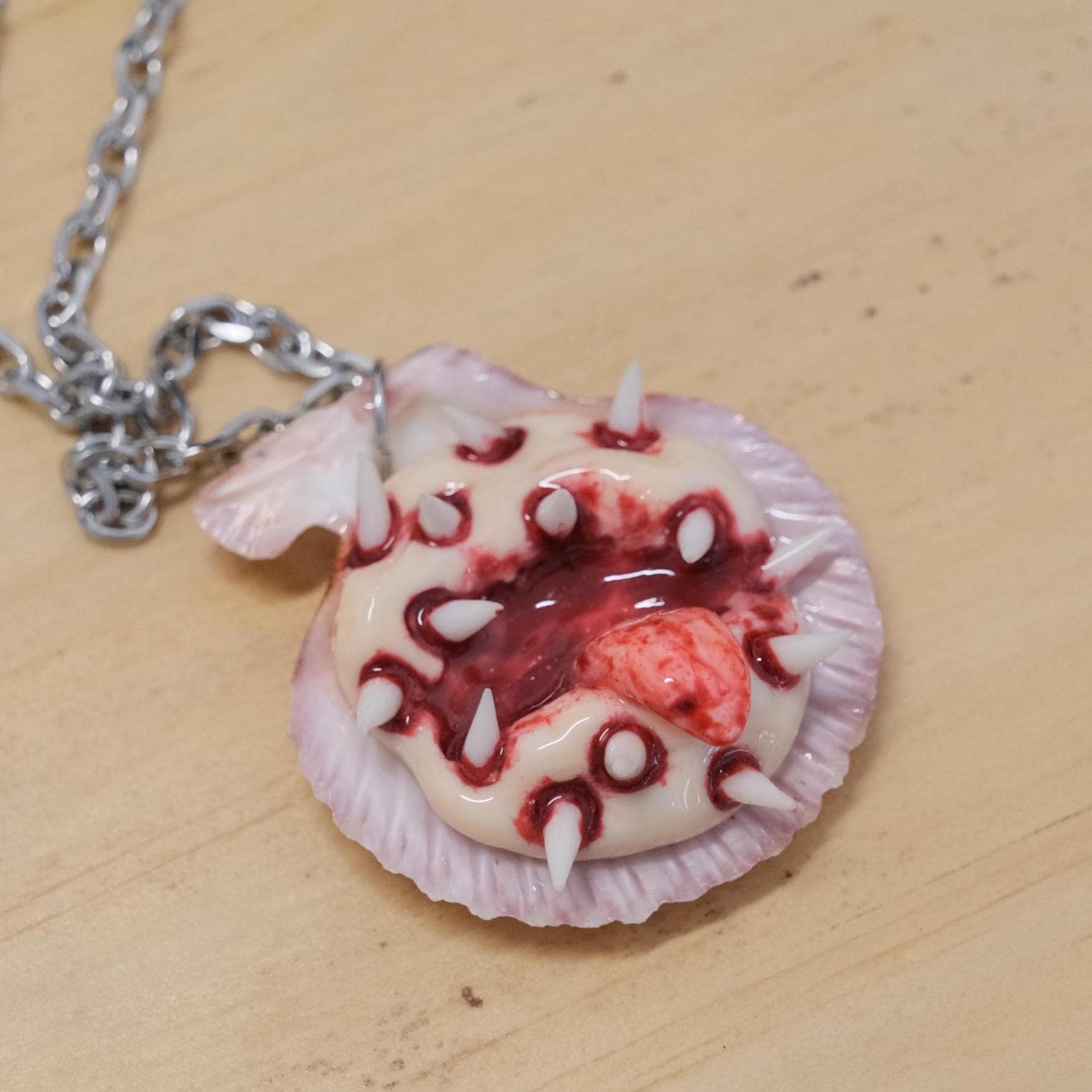 This handmade gothic pendant necklace is a spine-tingling fusion of dark fantasy and organic horror. Crafted from real seashells and sculpted clay,