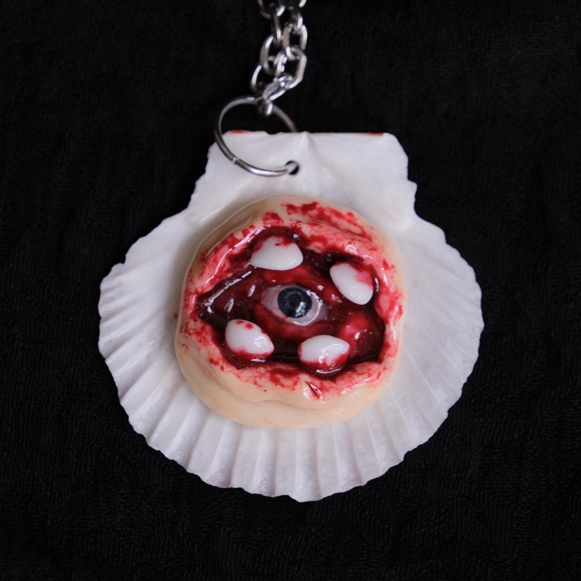 This handmade gothic pendant necklace is a spine-tingling fusion of dark fantasy and organic horror. Crafted from real seashells and sculpted clay, each piece features a hand-painted devilish eyeball surrounded by eerie teeth, making every necklace a one-of-a-kind oddity.