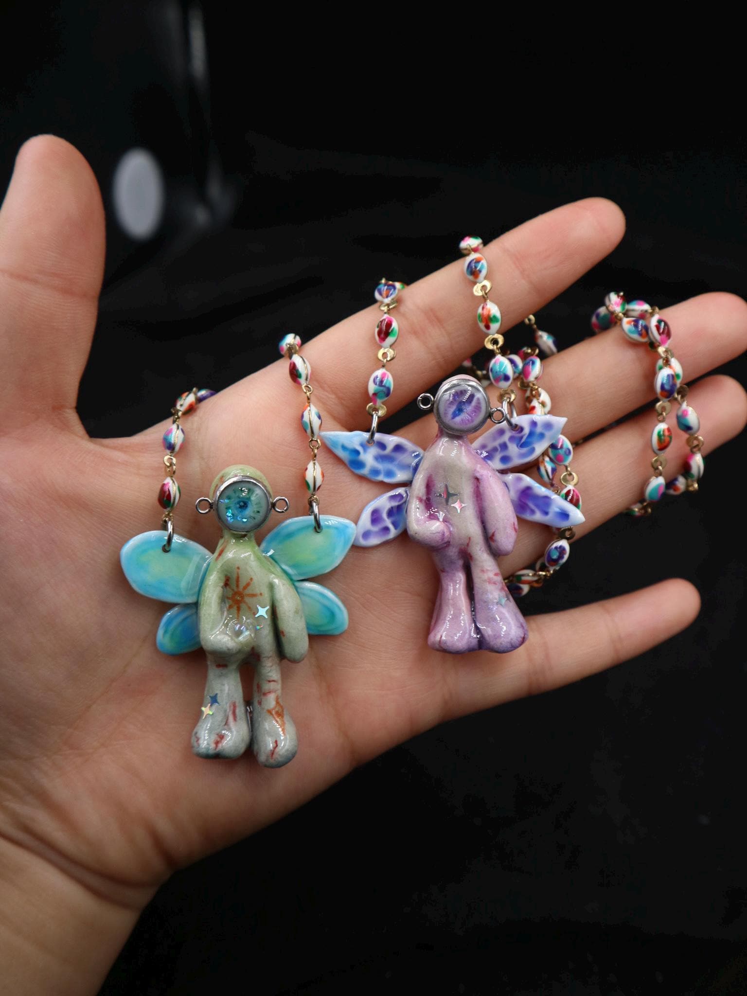 Step into a dreamy realm where fantasy meets the cosmos with this handmade polymer clay necklace, featuring an enchanting fairy angel alien figure. Blending surreal art with whimsical design, this piece adds a magical, otherworldly charm to your style.