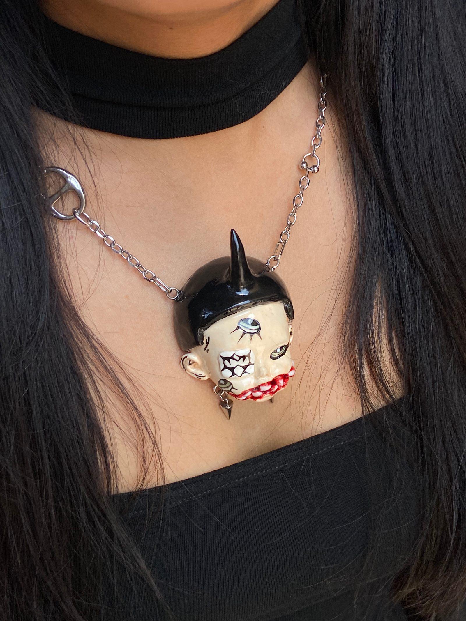 This doll head choker is one of my absolute favorites. Each one is unique – I sculpt, paint, and detail every face by hand. No molds, no copies – just one-of-a-kind weird and wonderful accessories.