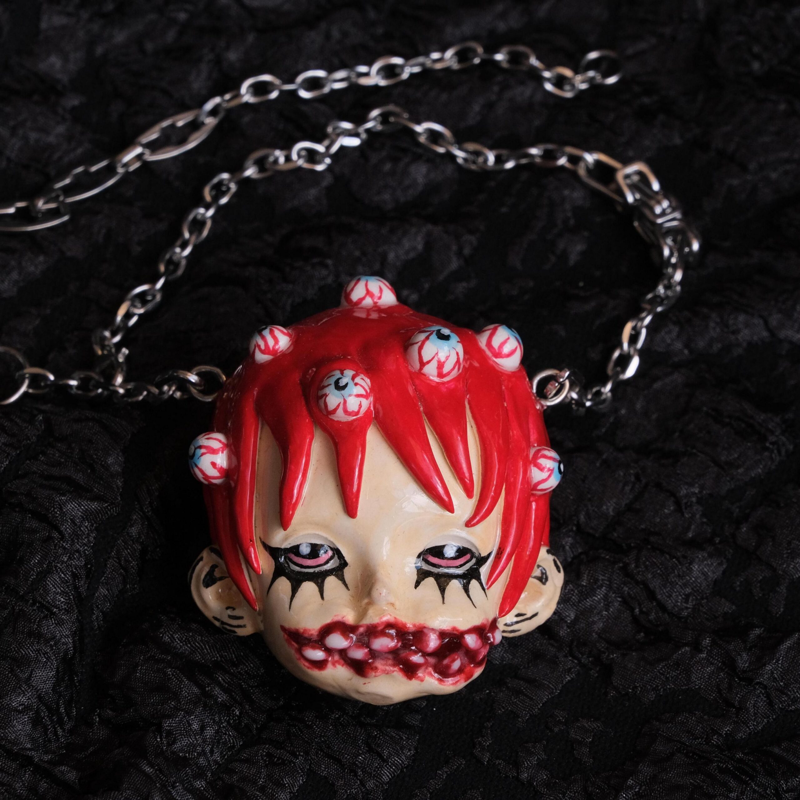Embrace the dark aesthetic with this OOAK Gothic Doll Face Pendant Necklace, featuring a hauntingly detailed handcrafted doll face set in intricate black metalwork. This unique piece stands out as a captivating statement accessory for those drawn to creepy cute and alternative styles, blending eerie charm with artistic craftsmanship.